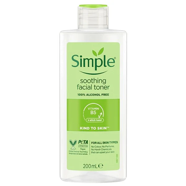 A fantastic skincare regimen can be as straightforward as 1, 2, and 3 — with the middle step being a face toner, of course! Our Simple Kind to Skin Soothing Facial Toner is made with a unique blend of Simple skin-toning effectiveness, including pro-vitamin B5, chamomile, witch hazel, and allantoin to help keep your skin invigorated and toned.
